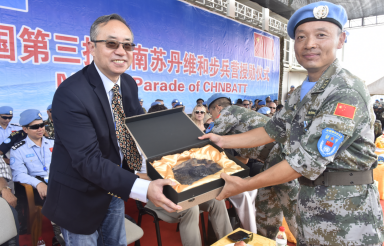 聯(lián)南蘇團(tuán)維和部隊(duì)向國際友人贈(zèng)彩陶助和諧